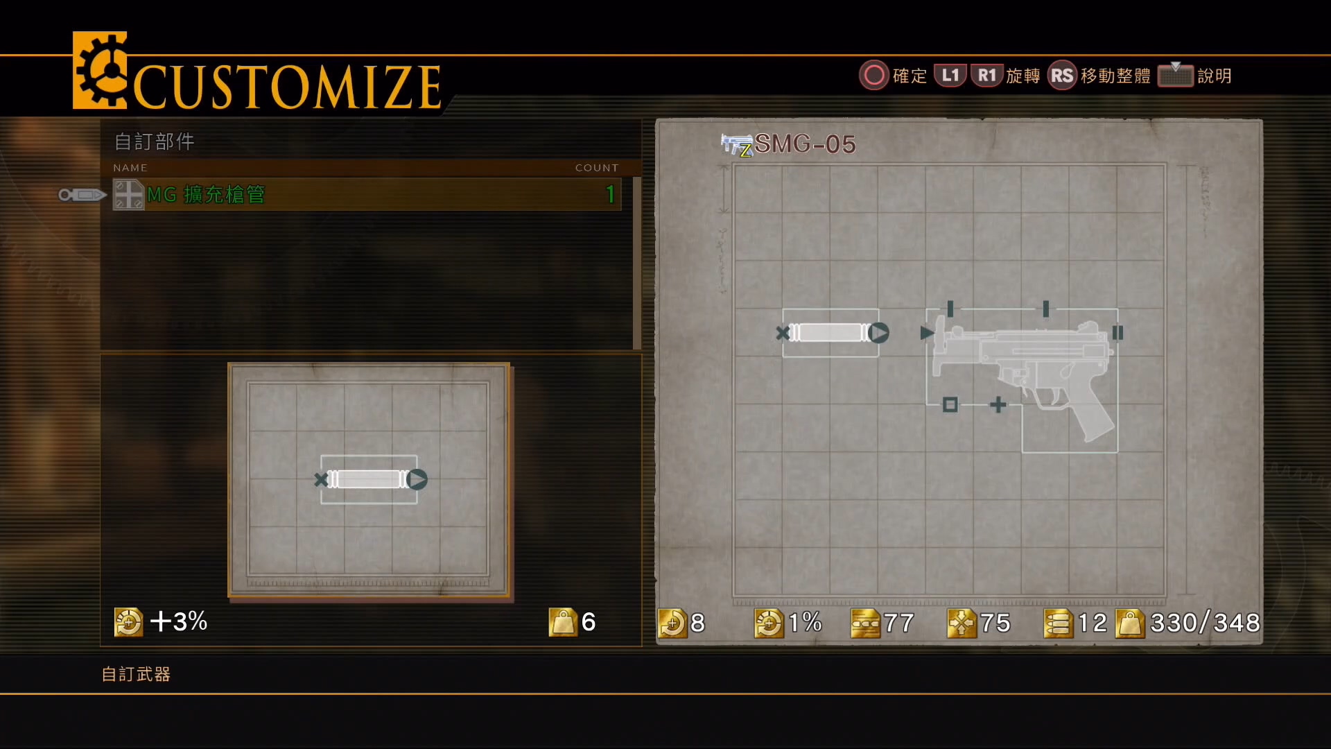 像其他遊戲一樣,可以透過分解物品、商店購買或者打怪掉落等方式取得材料,再將材料合成為裝備,但主要特殊是在裝備自訂上,合成後的部件使用很有組裝槍械的感覺,例如可以給手槍加上個長槍管、瞄準鏡之類的,同樣符號的部位才可以組合上去。